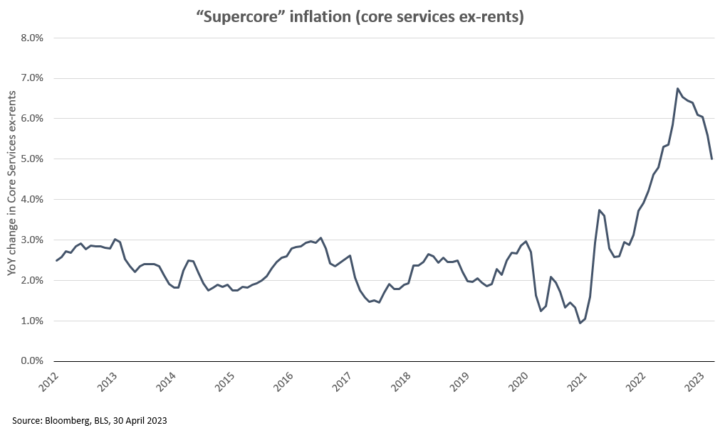 3. Der von Jerome Powell bevorzugte Indikator "Kerndienstleistungen ohne Unterkunft" geht zurück. Dies ist der wichtigste Indikator für Powell, da wir hier eine Lohn-Preis-Spirale sehen könnten. Die meisten Posten in dieser Unterkategorie werden stark von den Löhnen beeinflusst. Bislang scheint sich die Lohn-Preis-Rückkopplung abzuschwächen. Und das ist eine wirklich gute Nachricht. Denn sie untermauert den Gedanken, dass die Fed zumindest vorerst keine weiteren Erhöhungen mehr vornehmen wird."