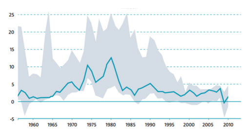 Wenn die Notenbanken sich an einem Inflationsziel von 2 % orientieren, liegen dem keine Forschungsergebnisse zugrunde, wonach dieser Wert optimal wäre. Tatsächlich wurde diese Größenordnung im Jahr 1989 von der neuseeländischen Notenbank willkürlich festgelegt. Die Europäische Zentralbank, die US Federal Reserve, die japanische Notenbank und die Bank of England verfolgen allesamt weiterhin ein Ziel von 2%, obwohl die Inflation in den jeweiligen Währungsräumen in den letzten zehn Jahren fast durchgängig darunter lag.