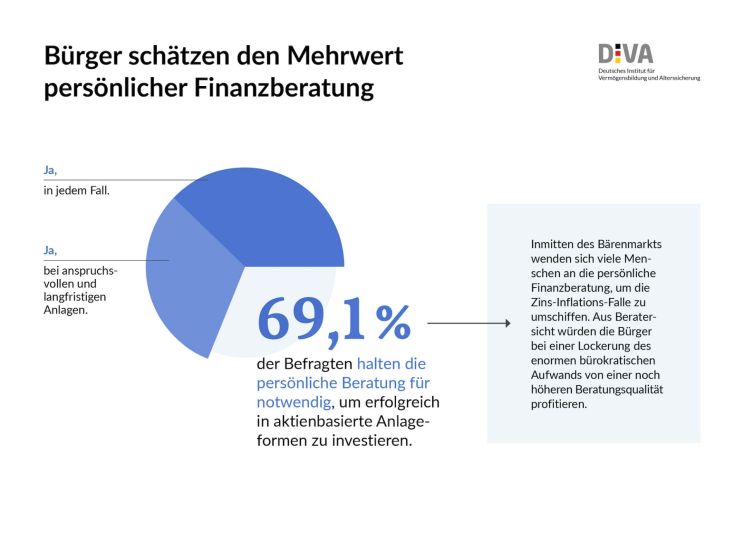 Die DIVA-Umfrageergebnisse untermauern diese Einschätzung: Immerhin 69,1 Prozent der befragten Bürger erachten eine Beratung für notwendig, wenn es um aktienbasierte Geldanlage geht, knapp die Hälfte davon vor allem bei anspruchsvollen und langfristigen Anlagen. Dies könnte ein Indiz dafür sein, dass bei kurzfristig orientierten, dann vermutlich spekulativ geprägten Aktienkäufen Trading-Apps und der Online-Handel eine zunehmende Rolle spielen.