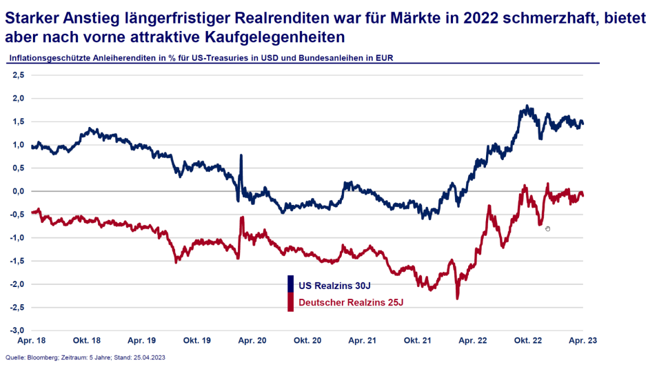 Doch die Inflation bleibe das beherrschende Thema, wobei diese ihre Hochpunkte in den großen Währungsräumen vorerst wohl überschritten hätten, so Matthes. Denn wesentliche Treiber der Verbraucherpreise aus dem letzten Jahr, wie etwa die Lieferengpässe, beruhigten sich. Zudem normalisierten sich die Energiepreise. Und der Haupttreiber, die monetäre Inflation, gehe ebenfalls zurück. „Die Inflation folgt der Geldmenge mit einem Zeitverzug von ein bis zwei Jahren“, weiß Matthes. Aber trotz aller disinflationärer Effekte werde die Teuerungsrate wohl nicht wieder so schnell unter die von den Notenbanken anvisierte Marke von zwei Prozent rutschen. Grund hierfür sei eine Reihe struktureller Faktoren wie Onshoring und der Lohndruck aus der Demografie. Anleger müssten daher ihr Portfolio auch weiter mit inflationsindexierten Anleihen, Aktien von Unternehmen mit starker Wettbewerbsposition und hoher Preismacht sowie Titeln mit deutlichem Dividendenwachstum vor der Teuerung schützen.