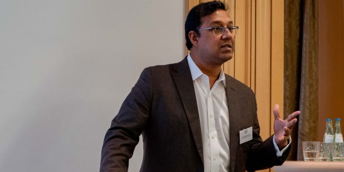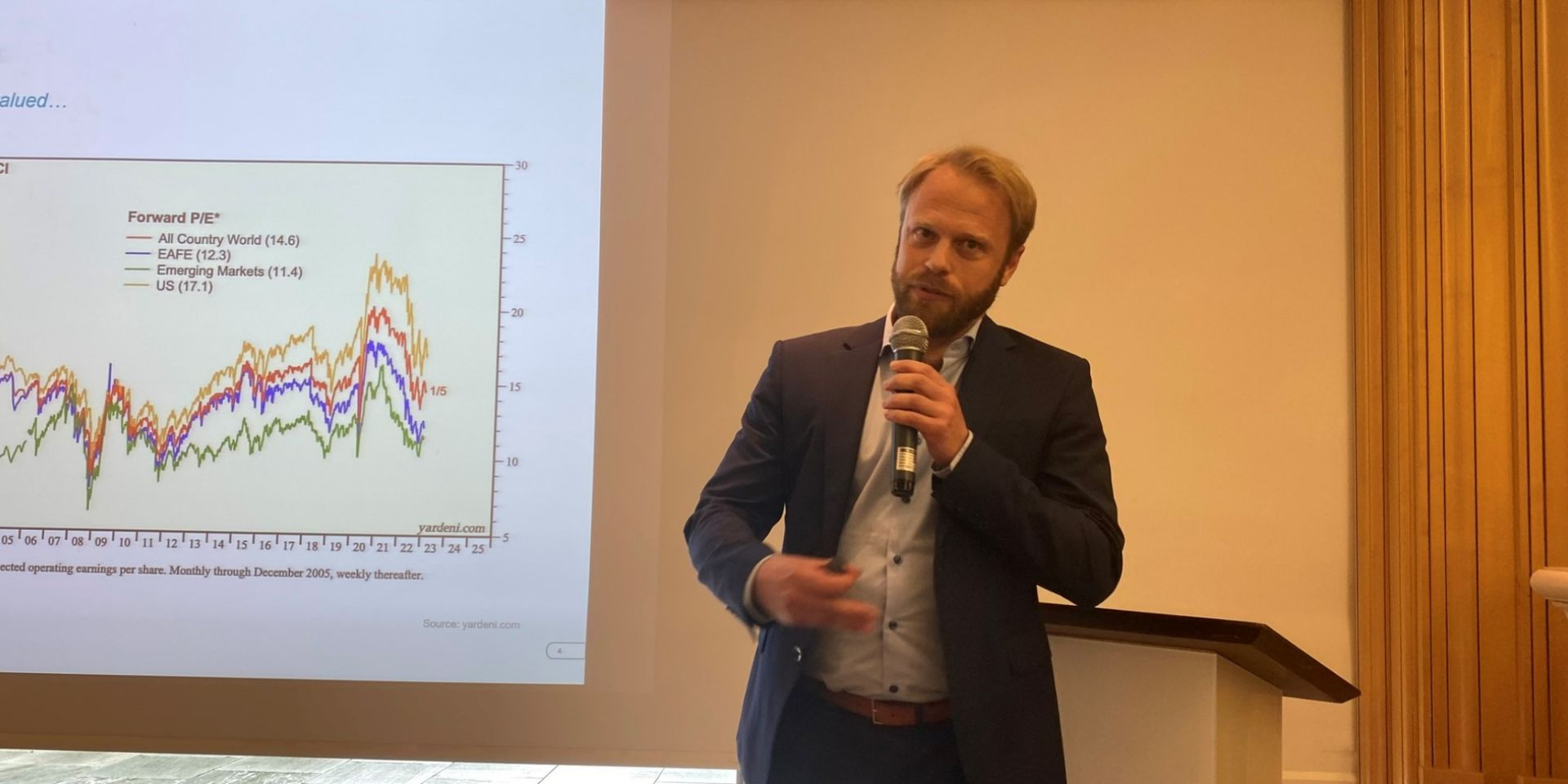 Matthes klärt die anwesenden Vermögensverwalter darüber auf, wie er als Mischfondsmanager das Zusammenspiel verschiedener Assetklassen und Währungen in seinem Portfolio steuert. Als Vorbild gelten ihm die Stiftungsfonds der US-Universitäten, die ein besonderes Augenmerk auf Korrelations- und Interaktionsverhalten der Portfoliobestandteile legen.