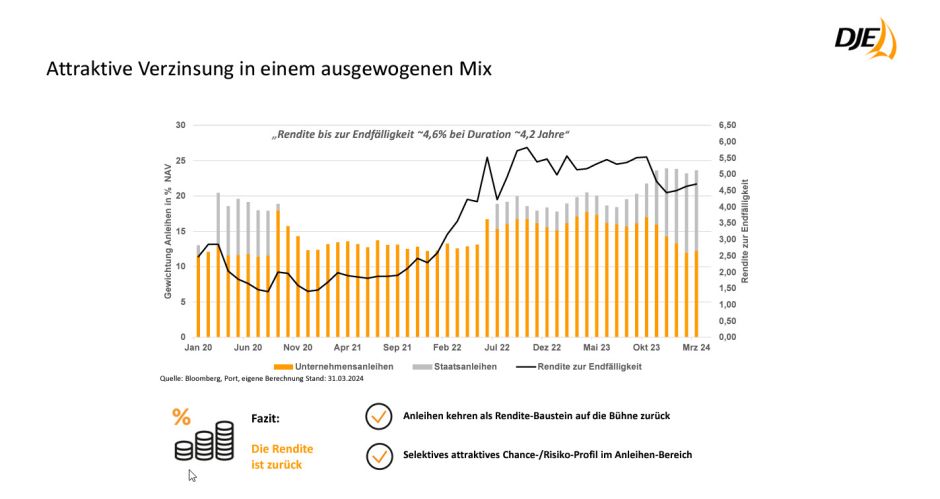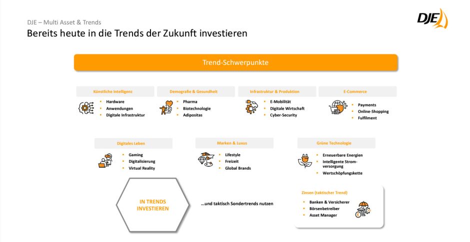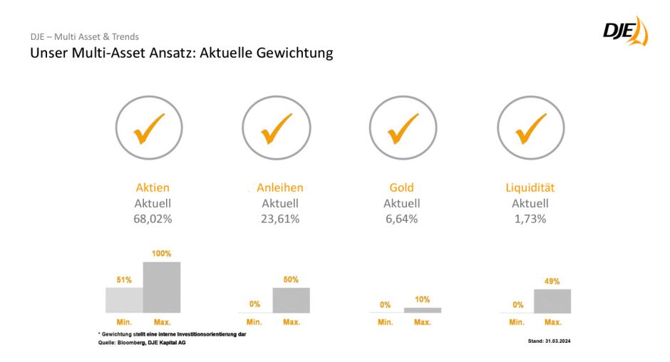 Insgesamt biete der Fonds Anlegern so einen flexiblen Zugang zu verschiedenen Assetklassen und investiere in strukturell wachsende Märkte unter Berücksichtigung der Risiken in unruhigen Zeiten. Rehmann betont die Bedeutung einer ausgewogenen Portfoliostrategie angesichts politischer Unsicherheiten und internationaler Krisen und beschreibt die Ausrichtung des von ihm betreuten DJE - Multi Asset & Trends wie folgt: Der Fonds investiere derzeit zu rund zwei Drittel in Aktien, 23 Prozent in Anleihen und sieben Prozent in Gold.