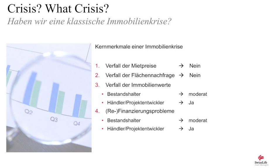 Walter Seul, Fondsmanager des Offenen Immobilienfonds „Swiss Life Living + Working“ von Swiss Life Asset Managers, räumt mit seinem Vortrag "Zinswende – Quo vadis Immobilien?" auf der Konferenz mit einem Missverständnis auf. Die Presse schreibe aus seiner Sicht häufig über eine schwere Krise am Immobilienmarkt. Doch es fehlten die klassischen Krisensymptome: Es gebe weder einen Verfall der Mietpreise noch der Flächennachfrage. Und auch der Verfall der Immobilienwerte von Core-Objekten sei moderat. Einzig der Zinsanstieg und dessen Wirkung auf die Immobilienwerte und die Finanzierungskosten würden den Markt belasten. Die aktuelle Situation am Immobilienmarkt deute eher auf eine geschäftsmodellbezogene Finanzstrukturkrise hin. So gerieten vornehmlich Geschäftsmodelle, die stark von Fremdfinanzierungen abhängig sind, ins Wanken. Auch transaktionsgetriebene Geschäftsmodelle litten aktuell. Das werde sich im Zeitablauf auflösen. Gut sieht es sogar für eigenkapitalbasierte Immobilieninvestitionen aus, die stabile Cashflows (Mieten) aufwiesen.