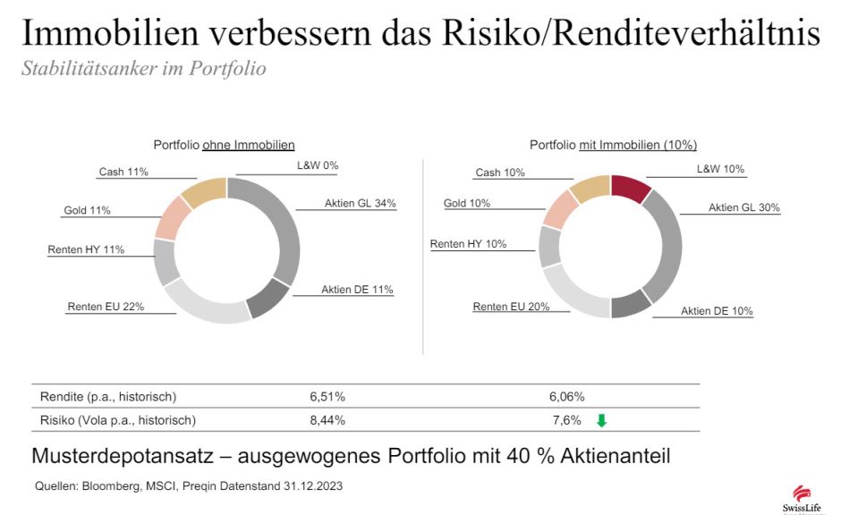 Zum Abschluss seines Vortrages legte Seul den anwesenden Vermögensverwaltern und Finanzberatern dar, weshalb Offene Immobilienfonds auch in Zukunft eine wichtige Rolle im Depot der Anleger spielen können. So könne der Swiss Life Living + Working einen wichtigen Beitrag dazu bringen, das Risiko-/Renditeverhältnis im Portfolio zu verbessern. „Wir haben dies genau untersucht. Dabei hat sich gezeigt, dass eine zehnprozentige Beimischung unseres Swiss Life Living + Working ins Gesamtportfolio neben anderen Effekten die Volatilität deutlich reduziert.“ Und dieser Effekt sei insbesondere für risikoaverse Anleger interessant.