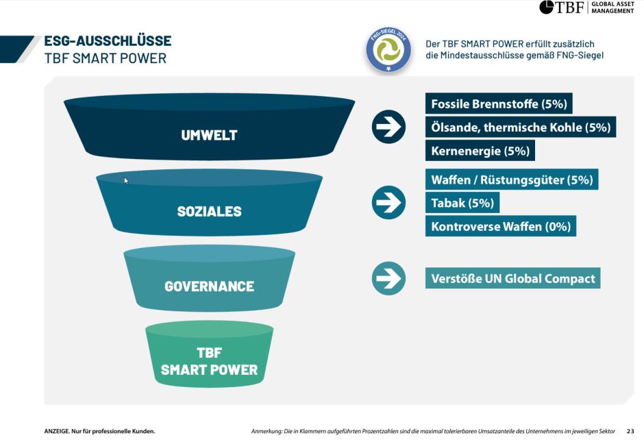 Der Portfoliomanager erklärt weiterhin, wie er vorgeht, um Unternehmen mit dominanter Marktposition, diversifizierten Geschäftsmodellen und attraktiven Bewertungen zu finden: Der Investmentprozess von TBF SMART POWER umfasse Ideenfindung, Research, Portfolioaufbau und Risikomanagement. Eine tiefgehende Analyse der gesamten Energieinfrastrukturbranche identifiziere immer wieder sehr attraktive Investitionsmöglichkeiten. „Für uns ist es wichtig, dass die Unternehmen diversifizierte Geschäftsmodelle aufweisen, die lukrativ, nachhaltig sowie innovativ sind und somit auch ohne Subventionen überlebensfähig sind. Die Konzerne sollten gesunde Bilanzen, eine niedrige Verschuldung und hohe Profitmargen aufweisen.“ Dabei würden auch ESG-Kriterien in den gesamten Investmentprozess integriert, um Nachhaltigkeitsrisiken auszuschließen.