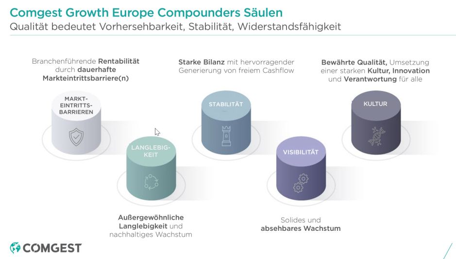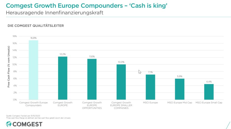 Wolfgang Fickus betont in seinem Vortrag „Die ewige Rendite?“ die Kraft und die Bedeutung des Qualitätswachstums als zentrale Anlagestrategie. Comgest verfolge diesen Stil konsequent über alle Strategien und Fonds hinweg. Ein besonderes Augenmerk lenkt Fickus auf die Anlagephilosophie der Comgest Growth Europe Compounders und des Comgest Growth America. Die Strategien der Fonds zeichneten sich durch ihre Fokussierung auf Unternehmen mit nachhaltigem und stabilem Wachstum aus, die durch starke Bilanzkennzahlen und hohe Innenfinanzierungskraft überzeugen. Der freie Cashflow als Prozentsatz des Umsatzes sei hier ein entscheidendes Kriterium, wobei die Comgest Growth Europe Compounders Strategie hier besonders hervorstechen würde.
