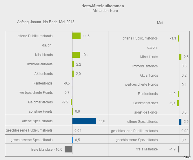 Unter dem Strich steht ein Plus: Laut aktueller Statistik des Deutschen Fondsverbandes BVI sammelten Fonds seit Jahresanfang mit Ende Mai netto 45 Milliarden Euro ein. Allein im Mai verzeicneten Investmentfonds ein Plus von netto 1,5 Milliarden Euro. Offenen Spezialfonds flossen 2,5 Milliarden Euro an frischem Kapital zu. In Geschlossene Fonds investierten Anleger im Mai netto 0,1 Milliarden Euro. Aus offenen Publikumsfonds flossen allerdings zum ersten Mal in diesem Jahr 1,1 Milliarden Euro ab. Aus freien Mandaten zogen Anleger elf Milliarden Euro ab.