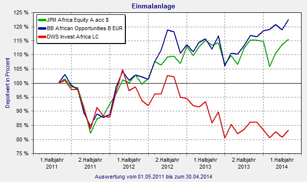 Spannend wird der Blick auf die Performances dieser drei größten Fonds. Denn im Zeitraum von drei Jahren waren es nicht die internationalen Big Player JP Morgan oder DWS, die die höchste Rendite einfuhren, sondern die vergleichsweise kleine Gesellschaft Bellevue: Der BB African Opportunities schaffte eine Wertentwicklung von 22,5 Prozent. Der JP Morgan Africa Equity kommt auf 15,5 Prozent. Und der DWS Invest Africa muss mit -16,7 Prozent schmerzliche Verluste verkraften. Aber nicht nur über drei Jahre überzeugt Bou-Diabs Fonds. Auch im vergangenen Jahr ließ er seine beiden Mittwerber hinter sich. Während er auf 4,3 Prozent kam, musste sich Biryulyov und Sonna von JP Morgan mit 1,5 Prozent begnügen. Die DWS-Fondsmanager Kahlfeld und Pack traf es deutlich härter: Sie verloren 2013 11,6 Prozent. Dieser Trend setzt sich auch im laufenden Jahr fort. Der Bellevue-Fonds kommt in den ersten vier Monaten auf eine Wertentwicklung von 3,4 Prozent, für JP Morgan reichte es lediglich zu 0,6 Prozent. Und die DWS verbuchte Verluste in Höhe von 0,2 Prozent. Die Performance wird auch in der dreijährigen Sharpe Ratio sichtbar: Bei den Schweizern beträgt sie 0,27, bei JP Morgan 0,14. Für den DWS-Fonds ist sie negativ.