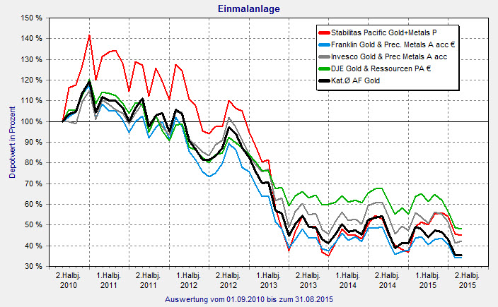 Deutlich mehr Volumen hat der Franklin Gold & Precious Metals (ISIN: LU0496367417), der von Steve Land und Frederik Fromm verwaltet wird. Für das laufende Jahr steht noch ein Minus von 8,9 Prozent, allein im August ging es jedoch um rund 1,1 Prozent nach oben. Kanadische Minenaktien machen mit 57,5 Prozent den größten Anteil aus. Australische kommen auf knapp zehn Prozent. Größte Einzeltitel sind Newcrest Mining (5,0 Prozent) und mit jeweils 4,7 Prozent Randgold Resources sowie Eldorado Gold. Mit einer Volatilität von 33,7 Prozent über drei und 30,1 Prozent über fünf Jahre, ist der Fonds deutlich schwankungsärmer als das Stabilitas-Produkt. Insgesamt ist er mit der FondsNote 3 bewertet.