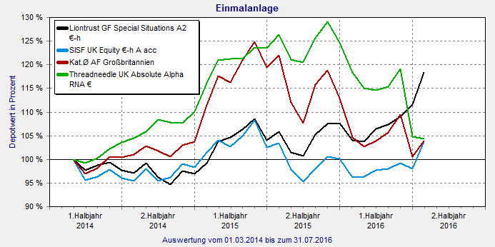 Der Brexit hat Anleger also verschreckt – allerdings scheinbar erstmal nur kurzfristig. Den Juli konnte die große Mehrheit der britischen Aktienfonds bereits wieder im grünen Bereich abschließen. Im laufenden Jahr ist jedoch weiterhin viel Luft nach oben. Nur zwei Fonds können bisher ein positives Ergebnis vorweisen. Zum einen der Liontrust GF Special Situations A2 EUR Hedged (ISIN: IE00B5L7K045). Der 20,7 Millionen Euro schwere Fonds erzielt im laufenden Jahr ein Plus 9,9 Prozent. Zum anderen der SISF UK Equity (ISIN: LU1015430488). 3,59 Prozent erzielt der 206 Millionen Euro schwere Fonds im laufenden Jahr. Beide Fonds sind noch sehr jung (Auflegung 2012 und 2014). Zu den Top-5-Fonds gehört mit einem Verlust von 3,4 Prozent auch der JOHCM UK Opportunities (ISIN: GB00B0LLB641). Er trägt zudem die FondsNote 1. Sie misst das Rendite-Risiko-Verhältnis über vier Jahre. Über zehn Jahre hat der 975,9 Millionen Euro schwere Fonds eine Wertsteigerung von 108,7 Prozent erzielt. Damit ist er in diesem Zeitraum der erfolgreichste Fonds. Bis zu 10 Prozent des Fondsvermögens können in Unternehmen außerhalb des Vereinigten Königreiches angelegt werden. Mit 5,8 Prozent ist Royal Dutch Shell derzeit die größte Position. Es folgen National Grid (5,6 Prozent) und Birtish American Tobacco (4,5 Prozent). Zu den großen Verlieren gehört dagegen beispielsweise der Threadneedle UK Absolute Alpha RNA (ISIN: GB00B53CDN14). 2016 muss er einen Verlust von 16,4 Prozent verkraften. Seit seiner Auflegung 2010 erzielt das Schwergewicht (1,3 Milliarden Euro) ein Plus von 29,4 Prozent.