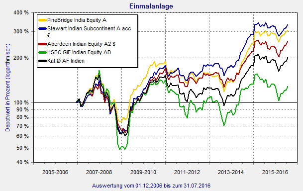 Sieger mit einem Plus von 14,4 Prozent ist 2016 bisher der BTS Gate of India D (ISIN: LU0476355275). In den vergangenen sechs Monaten kommen 25,7 Prozent hinzu. Seit seiner Auflegung 2010 erzielt der Fonds ein Plus von 40,7 Prozent. Insgesamt sind jedoch nur 6,3 Millionen Euro in den Fonds investiert. Mindestens zwei Drittel des Vermögens müssen in Aktien von Unternehmen mit Geschäftssitz in Indien angelegt werden. Derzeit fließen rund 30 Prozent in den Finanzdienstleistungssektor, rund 20 Prozent in den Industrie-Sektor. Größte Position mit 8,8 Prozent ist Bosch LTD. Mit TER von 2,84 Prozent ist der Fonds vergleichsweise teuer.