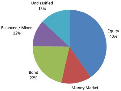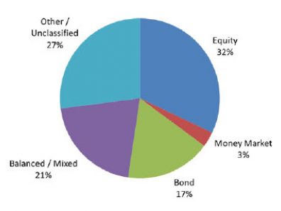 Auch bei der Anzahl ihrer Produkte belegt die Kategorie Aktienfonds Platz eins. Von den weltweit rund 91.600 Fonds (Stand: 31. Dezember 2014) machen sie 32 Prozent aus. Dahinter liegen Mischfonds mit 21 Prozent und Rentenfonds mit 17 Prozent.