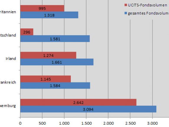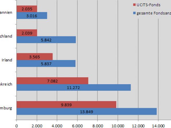Innerhalb der europäischen Union gibt Luxemburg den Ton an: Im Großherzogtum sind mit 13.849 Fonds die meisten Produkte gelistet – davon 9.839 nach UCITS-Norm. Auch das Gesamtvolumen ist mit 3,09 Billionen Euro am höchsten. Die UCITS-Fonds verwalten 2,64 Billionen Euro. Auf Platz zwei liegt Frankreich mit einer Gesamtanzahl von 11.272 Fonds die 1,58 Billionen Euro verwalten. In den 7.082 französischen UCITS-Fonds liegen 1,15 Billionen Euro. Platz drei belegt Irland. Auf der grünen Insel sind 5.837 Fonds beheimatet. Das sind zwar weniger als beim Viertplatzierten Deutschland (5.842), dafür ist das Volumen mit 1,66 Billionen Euro deutlich höher (Deutschland: 1,58 Billionen Euro) und damit auch höher als in Frankreich. Auch bei den UCITS-Fonds liegt Irland mit 3.565 Stück und einem Volumen von 1,27 Billionen Euro vor Deutschland mit 2.039 die insgesamt 296,4 Milliarden Euro verwalten.