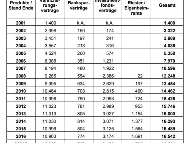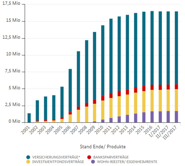 Anhaltenden Zuwachs verzeichnet dagegen das Wohnriestern bzw. die Eigenheimrente. Auch hier schwächt sich die Entwicklung allerdings ab. Während der Netto-Jahres-Zuwachs von 2010 bis 2014 um die 200.000 pendelte, fiel das Plus von 2015-2016 auf fast die Hälfte zurück. Eine Entwicklung, die nur durch einen exorbitanten Sprung im vierten Quartal korrigiert werden könnte. Im Jahresverlauf wurden bislang nur 60.000 neue Verträge aufsetzt. Auch wenn sich die Zuwachsrate im letzten Quartal deutlich abgeschwächt hat.