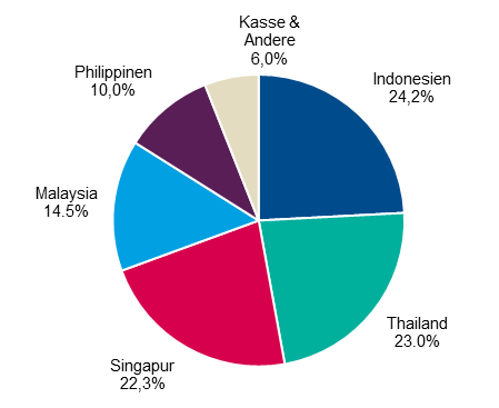Trotz der Besserung des wirtschaftlichen und politischen Ausblicks für Malaysia bleiben unsere bevorzugten Märkte Thailand, Indonesien und die Philippinen (TIP-Märkte). Thematisch gesehen konzentrieren wir uns aufgrund der günstigen wirtschaftlichen Fundamentaldaten der ASEAN-Region auf die unmittelbaren Nutznießer der strukturellen Erhöhungen von Infrastruktur- und Verbraucherausgaben. Auch weiterhin finden wir die Mehrheit solcher Unternehmen in den schnell wachsenden TIP-Wirtschaften, die zusammen etwa 60% des Fonds ausmachen.
