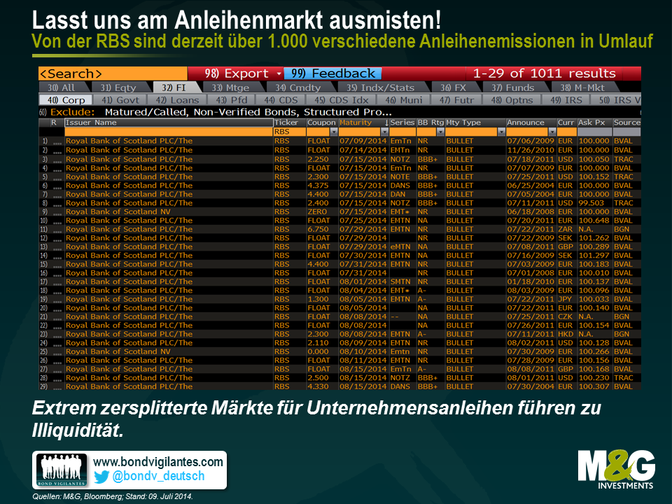 Wie lässt sich also erreichen, dass die Liquidität an den Märkten für Unternehmensanleihen und Credits ebenso hoch ist wie die an den Aktienmärkten? Betrachten wir zunächst einmal den Aspekt der Zersplitterung dieses Marktsegments. Wenn ich bei Bloomberg „RBS Corp“ eingebe und dann auf klicke, erhalte ich 1.011 Treffer. Dabei handelt es sich exakt um jene 1.011 unterschiedlichen RBS-Anleihen, die momentan in Umlauf sind. Auf 19 Seiten werden mir die einzelnen Anleihen angezeigt, deren Währungsdenominationen vom australischen Dollar bis zum südafrikanischen Rand reichen. Neben Papieren mit variablen Zinssätzen befinden sich darunter auch festverzinsliche Anleihen mit Kupons zwischen weniger als 1 Prozent und mehr als 10 Prozent, deren Restlaufzeiten irgendwo zwischen „sofort fällig“ und „unbefristet“ liegen. Des Weiteren gibt es auch inflationsgebundene Anleihen, abrufbare Papiere (mit integrierten Call-Optionen) sowie Anleihen mit ganz unterschiedlichen Vorrangigkeiten innerhalb der Kapitalstruktur (vorrangige Papiere, Lower Tier 2-Anleihen, Upper Tier 2-Papiere, Tier 1-Anleihen und Vorzugspapiere). Bei einigen dieser Emissionen sind mittlerweile sogar fast überhaupt keine Anleihen mehr in Umlauf, während bei anderen noch Papiere im Wert von über 1 Mrd. US-Dollar ausstehen. Für jede dieser Anleihen gibt es dann einen Verkaufsprospekt von mehreren hundert Seiten, auf denen die konkreten Einzelheiten, die Absicherungsmechanismen sowie die Risiken des entsprechenden Anlageinstruments detailliert aufgeführt werden. Die erste Möglichkeit, die Liquidität an den Anleihenmärkten zu verbessern, besteht also darin, bei den Anleihenemissionen einmal ganz gründlich auszumisten: ein Emittent, eine Aktie, eine Unternehmensanleihe.