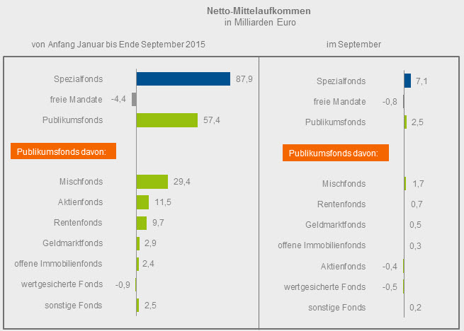 Im laufenden Jahr sammeln Fonds bisher 140,9 Milliarden Euro an frischem Geld ein. Das sei doppelt so viel wie in den ersten neun Monaten 2014 als Publikumsfonds, Spezialfonds und freie Mandate über 70 Milliarden Euro einsammelten, teilte der Branchenverband BVI mit.