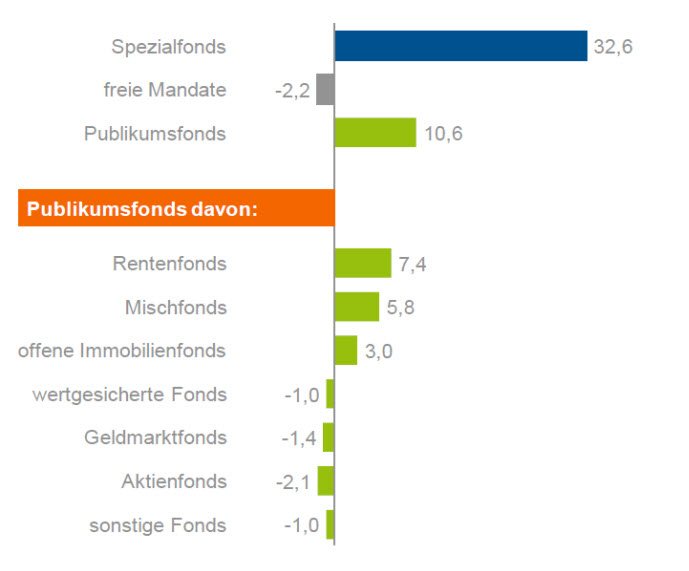 Der deutschen Fondsbranche sind im ersten Halbjahr netto 41,0 Mrd. EUR neue Mittel zugeflossen, wie die Halbjahreszahlen des BVI, Bundesverbands Investment und Asset Management zeigen. Dabei dominierten Spezialfonds das Neugeschäft. Sie sammelten 32,6 Mrd. ein. Publikumsfonds flossen 10,6 Mrd. EUR zu. Bei Spezialfonds sind insbesondere Versicherungen und Altersvorsorgeeinrichtungen bedeutende Investoren. Beide Anlegergruppen hatten im ersten Halbjahr 2013 drei Viertel des Neugeschäfts getragen.
