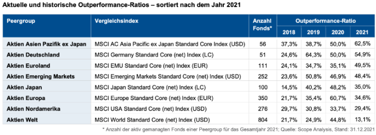 In der Kategorie mit der höchsten Outperformance-Ratio der acht betrachteten Vergleichsgruppen befinden sich laut Studie Fonds, die in die Region „Aktien Asien Pazifik ex Japan“ investieren. Hier gibt es sogar einen positiven Trend. Während 2020 nur die Hälfte der aktiv gemanagten Fonds den Vergleichsindex MSCI AC Asia Pacific ex Japan übertreffen konnte, waren es 2021 rund 62,5%. Hauptgrund für das gute Abschneiden: Viele Asien-Fonds hielten weniger chinesische Aktien als der Vergleichsindex. Chinesische Titel hatten 2021 deutlich korrigiert.