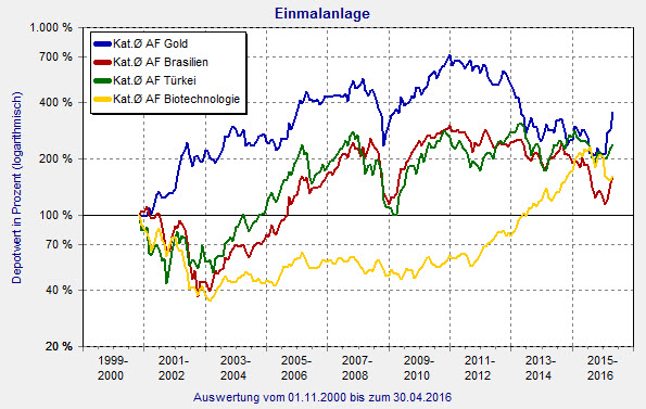 Mit dieser Entwicklung hat im letzten Jahr wohl kaum jemand gerechnet: 69 Prozent legt die Kategorie Aktienfonds Gold des FINANZEN FundAnalyzers (FVBS) im laufenden Jahr bereits zu – allein im April kommen 23,9 Prozent dazu. Die vergangenen Jahre gaben noch kein ganz anderes Bild ab: 2015 stand ein Verlust von 15,9 Prozent zu Buche, 2013 sogar 50 Prozent. Ein ähnliches Bild ergibt sich für die Kategorien Aktienfonds Brasilien und Türkei. Beide schlossen 2015 im zweistelligen Minus-Bereich ab, 2016 legen sie dafür bisher 28,9 Prozent und 16,8 Prozent zu. Das reicht für Platz zwei und drei im Vergleich. Aktienfonds Russland und Lateinamerika vervollständigen mit einem Zuwachs von 15,3 und 14,6 Prozent das Bild. Auch die Kategorie Aktienfonds Lateinamerika musste im vergangenen Jahr ein Minus von 21,4 Prozent hinnehmen. Eine positive Jahresbilanz konnte die Peergroup zuletzt 2012 einfahren. Der größter Verlierer bisher ist die Kategorie Aktienfonds Biotechnologie. 21,9 Prozent verlieren die ehemaligen Spitzenreiter in diesem Jahr. 2014 konnte sie noch ein Zuwachs von 44 Prozent verzeichnen und auch 2015 konnte mit 19,7 Prozent im zweistelligen Bereich abgeschlossen werden. Tief im Minus stehen auch italienische Aktienfonds. 11,5 Prozent büßen sie ein. Mit 7,2 Prozent in den roten Zahlen gehört zudem die Kategorie Aktienfonds Deutschland zu den Verlierern des laufenden Jahres. Immerhin kommt im April ein Plus von 0,3 Prozent hinzu. Nach wie vor steht gut zwei Drittel der Fondskategorien des FINANZEN FundAnalyzers in den roten Zahlen.