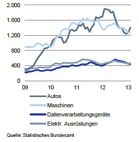 Auch in den USA sollte die Konjunktur in der zweiten Jahreshälfte wieder anziehen. Stobbe erwartet ein BIP-Wachstum von 2,3 Prozent und für die Industrieproduktion ein Zuwachs von 5,2 Prozent gegenüber dem Vorjahr. Davon könnten einige deutsche Branchen profitieren, wie beispielsweise Pharmaunternehmen. „Die deutschen Auto-Exporteure müssen allerdings zunächst einen tiefen Einbruch seit dem vierten Quartal 2012 verdauen und dürften daher die hohen Zuwachsraten des Jahres 2012 nicht mehr erreichen, zumal der US-Markt zunehmend aus lokaler Produktion deutscher Unternehmen bedient wird.“