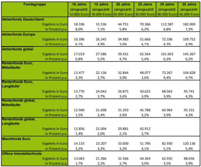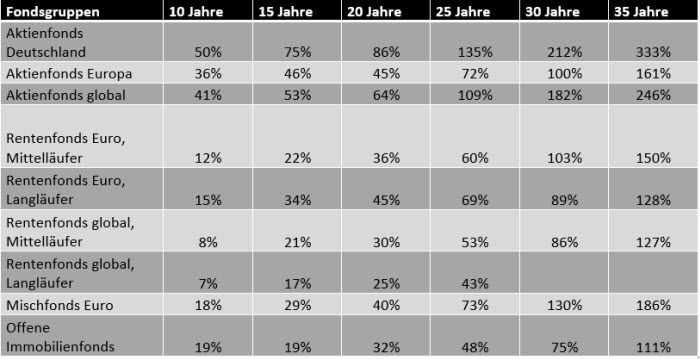 Abgeschlagen auf dem letzten Platz der Auswertung rangieren „Offene Immobilienfonds“, die bei Anlegern derzeit hoch im Kurs stehen. Ihr Ertrag bewegt sich in den kurzen Laufzeiten auf Rentenfonds-Niveau, fällt aber mit zunehmender Dauer deutlich dahinter zurück. Dennoch verdoppeln auch sie die Spareinlagen nach 35 Jahren.