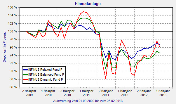 Der 18-Millionen-Euro-Fonds INFINUS Relaxed Fund (ISIN: LU0425671327) wurde ebenfalls im August 2009 aufgelegt. Für 2013 steht bisher ein leichtes Plus von 0,12 Prozent. In den vergangenen drei Jahren verlor der Fonds jedoch 3,65 Prozent. Die Volatilität über diesen Zeitraum ist mit 3,94 Prozent die niedrigste dieser drei INFINUS Fonds. Wie bei den anderen beiden ist die Sharpe Ratio negativ. Der defensive Dachfonds hält zu 51,52 Prozent Mischfonds (Stand: 31. Januar 2013). 35,7 Prozent des Portfolios machen Rentenfonds aus. Aktienfonds kommen auf 2,75 Prozent. Die größten Fondsanteile sind der Ethna-Aktiv E Inhaber Anteile (9,43 Prozent), der Carmignac Patrimoine A (8,95 Prozent) und der StarCap SICAV Windbonds (7,50 Prozent).