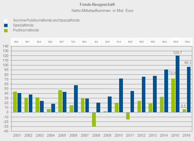 Während die Spezialfonds mit Zuflüssen in Höhe von 102,8 Milliarden Euro das zweitbeste Absatzergebnis ihrer Geschichte einfuhren, gingen die Mittel, die die Deutschen den Publikumsfonds anvertrauten, um mehr als 90 Prozent zurück: Nach 72 Milliarden Euro in 2015 konnten die Fonds im vergangenen Jahr nur 6,5 Milliarden Euro einnehmen - das schlechteste Ergebnis seit 2011. Damals wurden mehr als zehn Milliarden Euro aus den Publikumsfonds abgezogen.