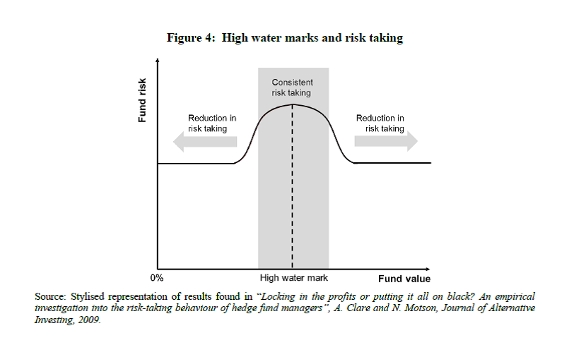 Demnach verhalten sich Manager auch bei einer Performance Fee mit HWM keineswegs immer rational. Zumindest nicht aus Sicht ihrer Investoren. Vielmehr scheint es so zu sein, dass ab einer gewissen Summe an Performance Fee-Rückstellungen Risiken abgebaut werden, um eben jenen Performance Fee-Topf nicht zu gefährden. Ist der Manager dagegen massiv „unter Wasser“, wird er ebenfalls Risiken abbauen. Die Intention dahinter ist klar: lieber vergleichsweise geringe fixe Gebühren auf ein stabiles bzw. leicht abnehmendes Volumen als einen kompletten „blow up“.