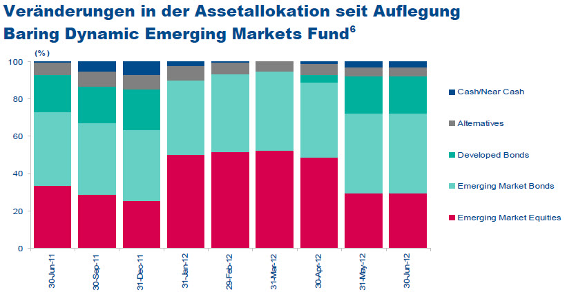Der Fonds wird von Barings erfolgreichem Multi-Asset Team gemanagt und wurde zur Nachbildung des £5 Milliarden1 großen Baring Dynamic Asset Allocation Fund (DAA) aufgelegt. Der flexible Investmentansatz ermöglicht es dem Dynamic Emerging Markets Fund schnell auf Veränderungen des Marktes zu reagieren. Seit seiner Auflegung erzielte er -7.07%2 bei einer Volatilität von 11.48%2. Im Vergleich dazu: -12.7%3 des MSCI Emerging Markets Index, der über die gleiche Zeit eine Volatilität von 21.4%3 aufweist. Das vom Fonds verwaltete Vermögen ist zum 29. Juni 20124 auf £125 Mio gewachsen.