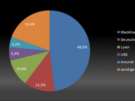 Marktführer in der ETF-Industrie bleibt der weltweit größte Vermögensverwalter BlackRock, bzw. dessen ETF-Tochter iShares. In Europa verwaltet die Gesellschaft ein Vermögen von 211,7 Milliarden Euro in 267 ETFs und hat einen Marktanteil von 48 Prozent. Dieser ist jedoch weiterhin leicht rückläufig. Ende 214 betrug er noch 48,4 Prozent. Bei den Mittelzuflüssen kann es keine andere Gesellschaft mit BlackRock aufnehmen: 11,9 Milliarden Euro generierte die US-Amerikaner im laufenden Jahr in Europa. Zum Vergleich: Auf Rang zwei folgt Lyxor mit Netto-Zuflüssen in Höhe von 3,8 Milliarden Euro, vor der Deutschen AWM mit 3,6 Milliarden Euro.