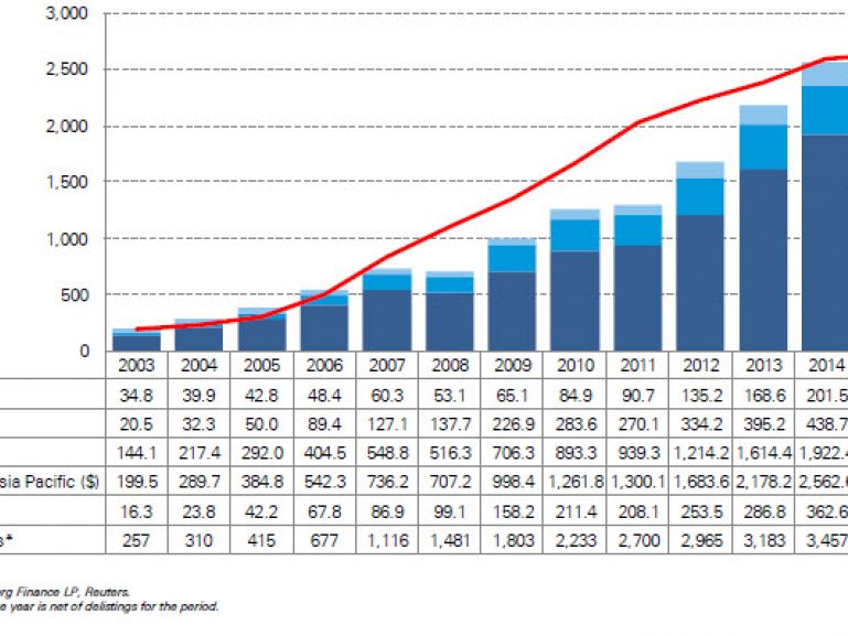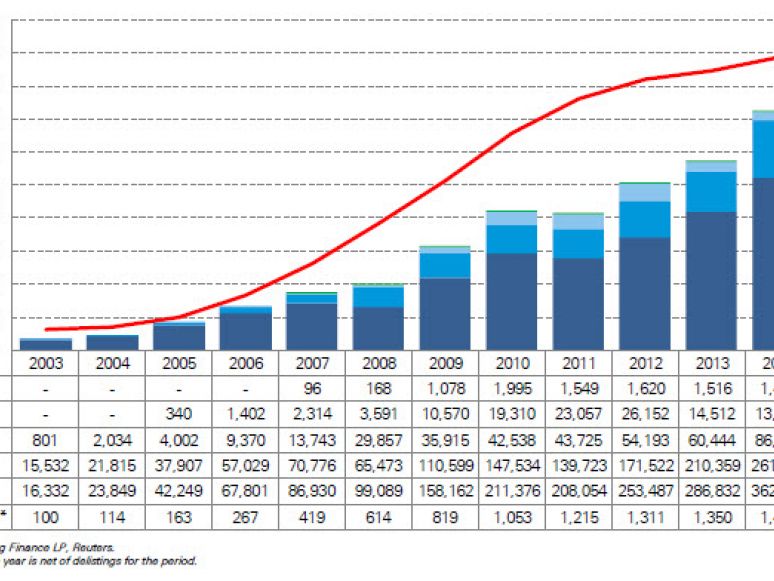 Der Vormarsch der Exchange Traded Funds (ETFs) geht auch in diesem Jahr weiter: Einer aktuellen Statistik der Deutschen Bank zufolge, stieg das Vermögen der in Europa, Asien/Pazifik und den USA verwalteten Passivprodukte bis zum 20. März 2015 um rund 175 Milliarden Euro auf 2,7 Billionen US-Dollar. Die Anzahl der einzelnen Produkte legte um 55 zu. Mit einem Volumen von gut zwei Billionen US-Dollar stellen die USA nach wie vor den weltweit größten ETF-Markt. Auf Platz zwei folgt – wenn auch abgeschlagen – Europa mit einem verwalteten Vermögen von 476,1 Milliarden US-Dollar (441,1 Milliarden Euro) vor Asien/Pazifik mit 218,3 Milliarden US-Dollar.