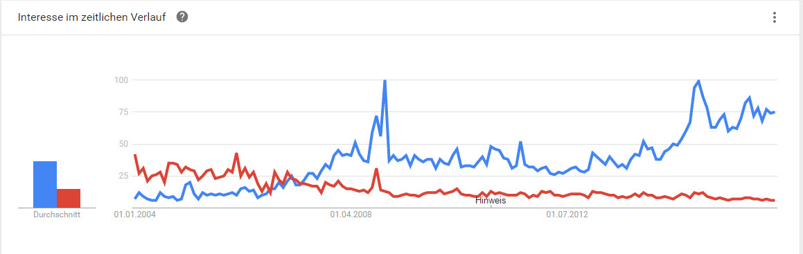 ETFs werden immer beliebter. Das zeigt nicht nur der stetige Zuwachs an Volumen. Immer öfter wird auch der Begriff ETF von den Deutschen im Internet gesucht. 2007 konnten die passiven Investmentprodukte Investmentfonds schließlich überholen. Seitdem zeigt sich: ETFs werden bei Google nicht nur wesentlich häufiger als Investmentfonds gesucht, sondern das Interesse wächst weiter.