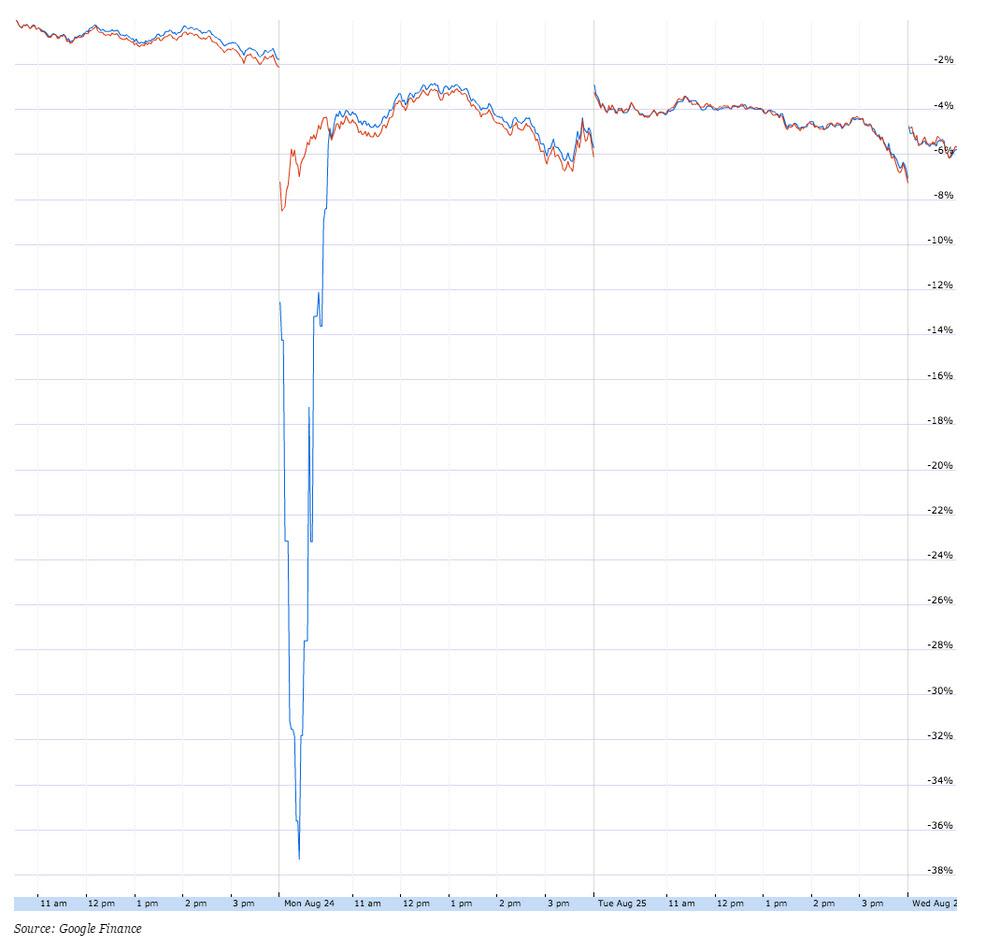Die rote Linie repräsentiert den SPDR S&P 500 ETF (SPY), die blaue Linie den Guggenheim S&P 500 Equal Weight ETF (RSP). Wie man unschwer erkennen kann, notierte der RSP am Morgen des 24. Augusts um mehr als 30% und der SPY um etwa. 6% tiefer. Der S&P 500 eröffnete mit ca. -4% zwar auch deutlich leichter, dennoch lagen beide ETFs weit unter dem fairen Wert ihrer Underlyings.