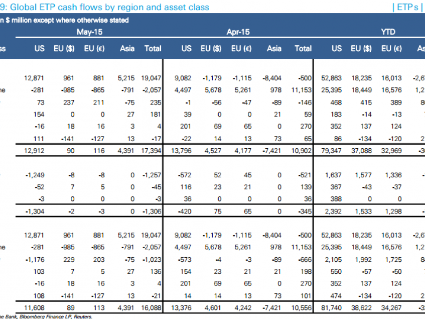 Exchange Traded Funds (ETFs) sind - einer aktuellen Statistik der Deutschen Bank zufolge - weiterhin gefragt. Per 12. Juni 2015 beliefen sich die Netto-Zuflüsse des laufenden Jahres auf 116,1 Milliarden US-Dollar – ein Zuwachs von rund vier Milliarden US-Dollar.