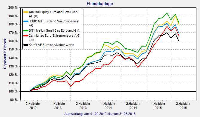 Es steht wieder deutlich besser um die Eurozone als noch vor einem Jahr. Das zeigt sich auch an den Aktienfonds der Währungsunion, die eine durchaus sehenswerte Performance im laufenden Jahr abliefern. Noch sehenswerter allerdings sind deren kleine Geschwister: die Nebenwerte-Fonds. Die Kategorie „Aktienfonds Euroland/Nebenwerte“ des FINANZEN FundAnalyzer (FVBS) verzeichnet 2015 (Stand: 31. August) eine Wertsteigerung von 14,6 Prozent. Die Aktienfonds der Standartwerte erreichen im gleichen Zeitraum ein Plus von 9,9 Prozent.