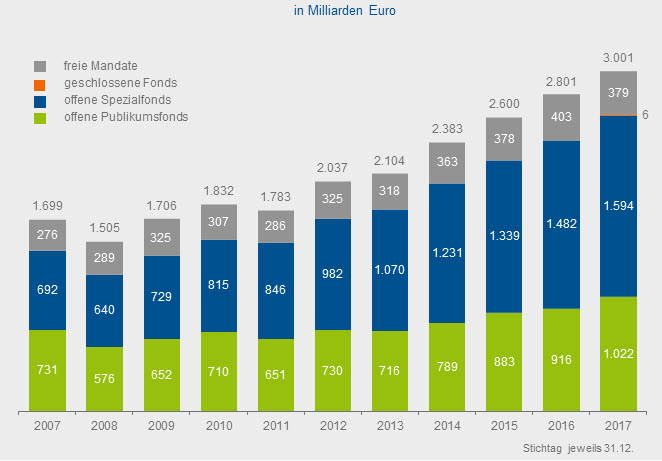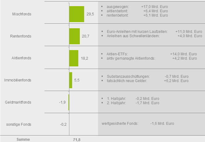 Netto flossen den Fonds 160 Mrd. Euro frisches Kapital zu. Die Fondsbranche verzeichnete 2017 damit ihr zweitbestes Absatzjahr seit Aufzeichnung. Den Bestwert hält das Jahr 2015 mit Nettomittelzuflüssen in Höhe von 193 Mrd. Euro.