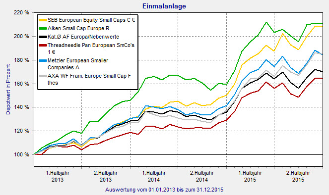 Nahezu 30 der mehr als 200 Fonds starken Peergroup erzielen 2015 einen Wertzuwachs von über 30 Prozent. Der Star unter diesen Fonds ist der SEB European Equity Small Caps (ISIN: LU0099984899). 39,2 Prozent geht es 2015 rauf. Seit seiner Auflegung 1999 erzielt der Fonds einen Wertzuwachs von 205,5 Prozent. Mittelfristig trägt der SEB-Fonds die FondsNote 1 - sie misst das Rendite-Risiko-Verhältnis über vier Jahre. Aktuell kostet der 351,6 Millionen Euro schwere Fonds 1,66 Prozent. Ebenfalls die FondsNote 1 trägt der Alken Small Cap Europe (ISIN: LU0300834669). 32,2 Prozent erzielt er in 2015. 287,6 Millionen Euro sind in den Fonds investiert. Mit einer TER von 2,1 Prozent ist er jedoch deutlich teurer als der SEB-Fonds.