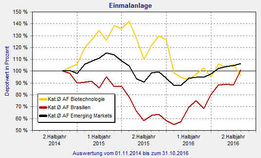 Lange galten Aktienfonds der Kategorie Gold im laufenden Jahr als der Top-Performer schlechthin. Jetzt bekommt das Denkmal erstmals Risse: Im Oktober verliert die Peergroup 7,2 Prozent – und zählt damit zu den stärksten Verlierern des Monats. Nur Aktienfonds Biotechnologie verzeichnen noch stärkere Einbußen in Höhe von 8,5 Prozent. Ganz anders sieht es für die Kategorie Aktienfonds Brasilien aus. Sie verzeichnet im Oktober im Schnitt den größten Zuwachs. Per Ende Oktober können sich Anleger so über eine Wertsteigerung von 73,3 Prozent seit Neujahr 2016 freuen. Gleichzeitig löst die Kategorie mit diesem Ergebnis die Kategorie Gold von der Spitze ab. Das ist umso erstaunlicher, als dass die vergangenen drei Jahre für die Peergroup ausschließlich im negativen Bereich endeten. Nichtsdestotrotz, Fondsmanager, die in brasilianische Titel investieren, bilden auch über zwölf Jahre eine relativ stabile Anlageklasse: Mit einem Zuwachs von 202,7 Prozent landet die Peergroup unter 123 Fondskategorien auf Platz 12.
