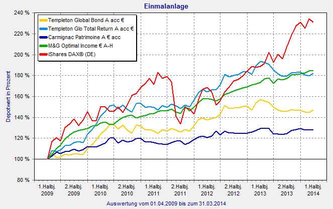 M&G stellt den viertgrößten Fonds. Der M&G Optimal Income (ISIN: GB00B1VMCY93) ist 20,6 Milliarden Euro schwer. Fondsmanager Richard Woolnough kann sich über eine Top-Bewertung freuen: Der Fonds trägt die FondsNote 1. Kein anderer der Big-5 schaffte das. Die Hälfte des Portfolios besteht aus Investment-Grade-Anleihen, 29,6 Prozent machen High-Yields aus. Staatsanleihen sind zu 23,4 Prozent allokiert. Aktien sind aktuell nur zu neun Prozent gewichtet. In den ersten drei Monaten 2014 ging es für Woolnough um 1,8 Prozent nach oben. Im vergangenen Jahr erreichte sein defensiver Mischfonds 7,2 Prozent. Eine beeindruckende Outperfromance zur Peergroup „Mischfonds primär Anleihen/Welt“ zeigt der Fonds über fünf Jahre: Er steigerte seinen Wert um 84,7 Prozent. Die Assetklasse kommt durchschnittlich auf 26,6 Prozent. Dafür mussten Investoren mit einer höheren Volatilität von 5,8 Prozent gegenüber 3,2 Prozent leben.