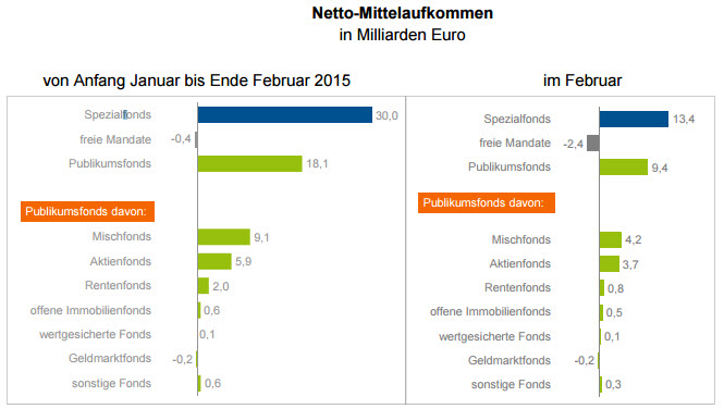 Bei den Publikumsfonds generierten Mischfonds mit 4,2 Milliarden die stärksten Zuflüsse im Februar. Aber auch Aktienfonds konnten zulegen: Ihnen vertrauten Anleger 3,7 Milliarden Euro an. Anleger kauften insbesondere ETFs auf den DAX und Euro Stoxx. Es war der absatzstärkste Monat für Aktienfonds seit Juli 2011. Damals flossen ihnen 4,1 Milliarden Euro zu. Rentenfonds sammelten 0,8 Milliarden Euro ein, offene Immobilienfonds 0,5 Milliarden Euro. Als einzige Assetklasse bei Publikumsfonds mussten Geldmarktfonds Abflüsse verzeichnen: Ihnen entzogen Anleger 0,2 Milliarden Euro.