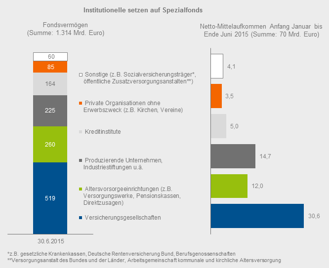 Bei den Spezialfonds sind Versicherungsgesellschaften und Altersvorsorgeeinrichtungen mit einem Vermögen von rund 780 Milliarden Euro die größte Anlegergruppe. Das entspricht einem Anteil von knapp 60 Prozent.