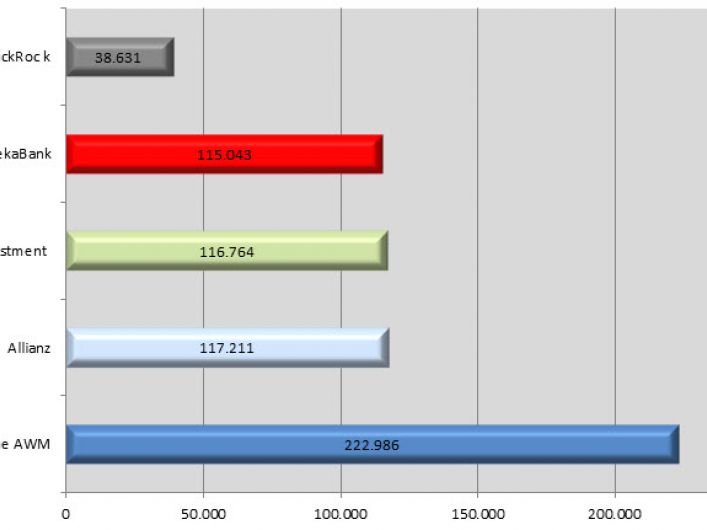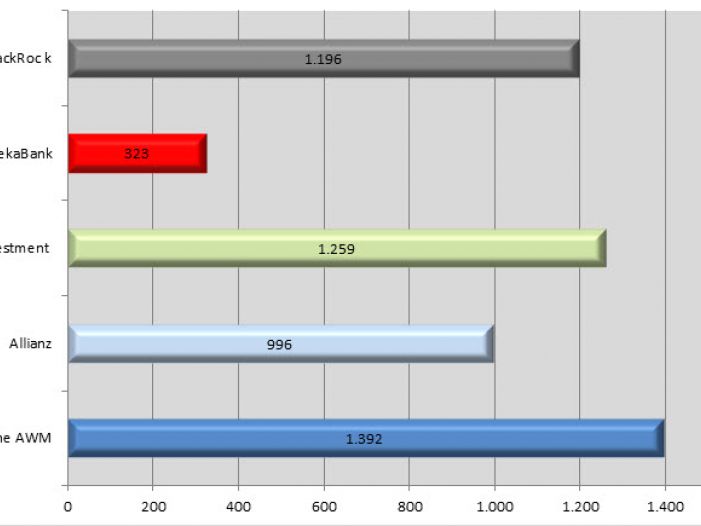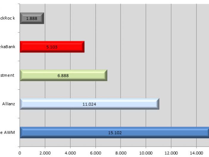 Nicht verwunderlich, dass die Deutsche Bank-Tochter auch die meisten Assets under Management vorweist. In den Publikumsfonds der Gesellschaft liegen insgesamt knapp 223 Milliarden Euro und damit mehr als 100 Milliarden Euro mehr als beim Zweitplatzierten, der Allianz. Der Münchner Konzern kommt auf ein verwaltetes Vermögen von 117,2 Milliarden Euro. Knapp dahinter folgen Union Investment (116,8 Milliarden Euro) und die DekaBank (115 Milliarden Euro). Deutliches Aufholpotenzial hat indes BlackRock, das mit Assets in Höhe von 38,6 Milliarden Euro abgeschlagen ist.