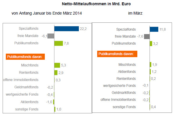 Die deutsche Fondsbranche verzeichnete im ersten Quartal 2014 Nettomittel-Zuflüsse in Höhe von 23,9 Milliarden Euro. Das geht aus der aktuellen Statistik des Bundesverbandes Investment und Asset Management e.V. (BVI) hervor. Allein im März sammelten Fonds deutscher Anbieter 7,4 Milliarden Euro ein. Dabei dominieren Spezialfonds: Anleger vertrauten ihnen im März 11,8 Milliarden Euro an und damit nur in diesem Monat mehr als die Hälfte der Quartalszuflüsse (22,2 Milliarden Euro). Der BVI führt diese Zuflüsse auf Sondereffekte zurück. Ein institutioneller Anleger habe ein freies Portfoliomandat in einen Spezialfonds überführt.