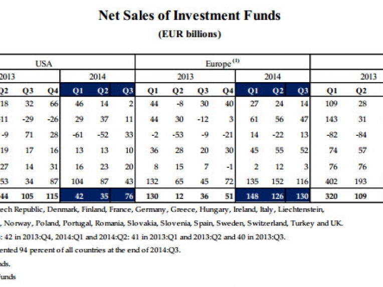 Das dritte Quartal 2014 war ein gutes für die globale Fondsbranche: Sie sammelte Cash-Flows in Höhe von 290 Milliarden Euro ein. Das geht aus einer aktuellen Statistik des europäischen Fondsverbandes EFAMA hervor. Das ist ein Anstieg gegenüber dem zweiten Quartal 2014, als den Fonds 252 Milliarden Euro zuflossen. Das weltweit verwaltete Vermögen in Investmentfonds beläuft sich demnach auf 27,2 Billionen Euro.