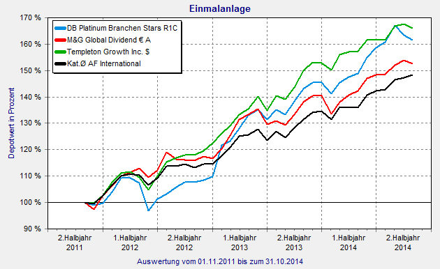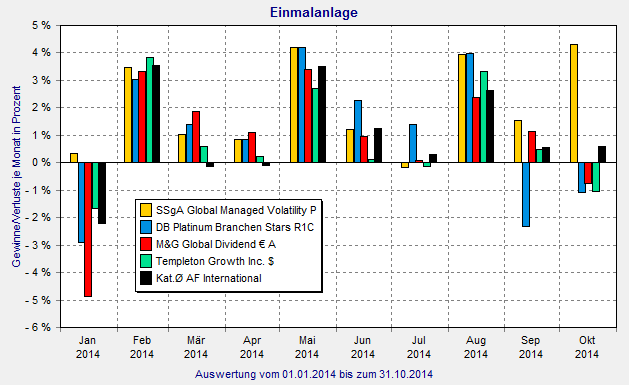 Unter den rund 1.400 Fonds dieser Peergroup schaffte es ein Neuling an die Spitze: Der SSgA Global Managed Volatility Equity Fund (ISIN: LU0450104905) wurde erst im Mai 2013 aufgelegt. Das Fondsmanagement-Team von State Street schaffte in den ersten zehn Monaten 2014 ein Plus von 22,5 Prozent. Das Fondsvolumen von rund 133 Millionen Euro fließt zu 51 Prozent in die USA. Japanische Aktien machen 11,6 Prozent aus, kanadische 7,6 Prozent. Auf Sektorebene setzt das Team in erster Linie auf Verbrauchsgüter (24,6 Prozent), Versorger (22,6 Prozent) und das Gesundheitswesen (21,8 Prozent). Größter Einzeltitel ist der US-IT-Konzern SBA Communications mit einem Portfolioanteil von 1,3 Prozent. Der israelische Arzneimittelhersteller Teva Pharmaceuticals und der US-Wasserversorger American Water Works Company folgen mit 1,2 Prozent dahinter. Der besondere Ansatz des Fonds: Während er darauf abzielt, langfristig Renditen zu erzielen, die zum MSCI World konkurrenzfähig sind, soll eine niedrige Volatilität beibehalten werden. Um den Erfolg dieser Strategie zu beurteilen, ist es jedoch noch zu früh. Immerhin ist die Rendite im laufenden Jahr stärker als die des MSCI World.