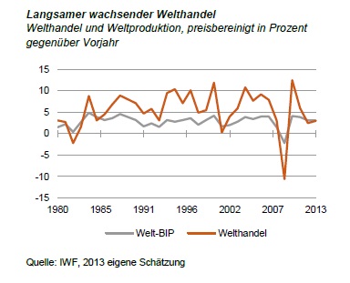 In der gesamten Nachkriegszeit war es ein verlässliches Muster, dass der Welthandel preisbereinigt schneller expandiert als das reale Bruttoinlandsprodukt. Die Grafik zeigt die Entwicklung seit 1980. Im Durchschnitt dieser Jahre nahm der Welthandel fast doppelt so stark zu wie die Produktion (5,5 % gegenüber 2,9 % p. a.).