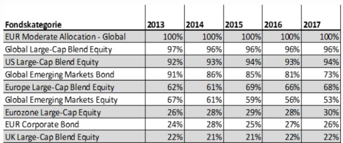 So kommt die Studie zu der Aussage, dass innerhalb der Kategorie „EUR Moderate Allocation – Global“ (Globale Mischfonds) 100% der Anlagesumme in ETFs allokiert waren, die ein Vier- oder Fünf- Sterne-Ranking hielten und damit besser performten, als die Mehrheit der aktiven Fonds dieser Kategorie. Dieses Ergebnis lässt aber kaum eine Aussage über ETFs der Kategorie zu, da lediglich 0,04% des gesamten Kategorie-Volumens in diese ETFs investiert sind, was kaum mehr als einer Handvoll Fonds entsprechen dürfte.
