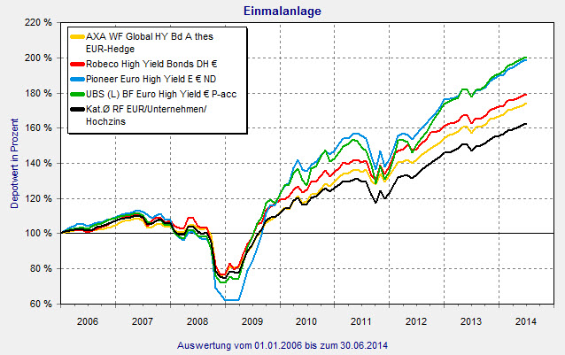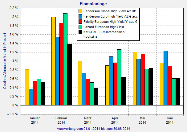 „Bei High-Yields sind die guten Zeiten vorbei“, warnen einige Investoren. So haben sich die Bestände im Segment High Yield mit Zuflüssen von über 100 Milliarden Euro seit 2011 nahezu verdoppelt. Vorsichtige Anleger denken da schon mal an Gewinnmitnahmen. Ein Blick in die Peergroup zeigt: Die Kategorie „Rentenfonds EUR/Unternehmen/Hochzins“ des FINANZEN FundAnalyzer (FVBS) erzielt im laufenden Jahr (Stand: 30. Juni 2014) ein Plus von 4,5 Prozent. Wie gut das ist, zeigt der Vergleich: Die Kategorie „Aktienfonds Deutschland“ schaffte beispielsweise im selben Zeitraum nur ein Plus von 2,7 Prozent.
