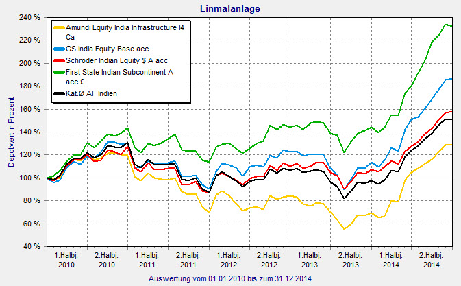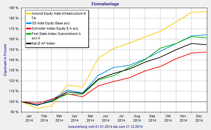 Hinzu kommt ein florierender Aktienmarkt. Der Leitindex BSE Sensex schloss das vergangene Jahr mit einem Plus von knapp 36 Prozent. „Doch auch nach der jüngsten Rallye könnten Anleger noch auf weitere Gewinne hoffen“, ist Rothschild-Mann Gerhardt überzeugt. Auch kleinere Rückschläge änderten nichts an der grundsätzlichen Attraktivität indischer Aktien. „Sollte es in dem einen oder anderen Punkt zu Verzögerungen kommen, dürfte dies unter den Anlegern sicherlich mal für Enttäuschung sorgen. Insgesamt sollte es mit der indischen Börse aber weiter bergauf gehen.“ Die Experten von Goldman Sachs hingegen warnen, dass die politischen Reformen nicht verzögert werden dürften. Auch ansteigende Rohstoffpreise könnten sich negativ auf die Entwicklung Indiens auswirken. Aktienfonds aus Indien entwickelten sich 2014 so stark, wie keine andere Kategorie des FINANZEN FundAnalyzer (FVBS). Sie verzeichneten ein durchschnittliches Plus von 54,7 Prozent. Auffällig ist, dass keiner der Fonds im vergangenen Jahr Verluste verzeichnete. Das genaue Gegenteil zu 2013: Damals schaffte keiner der Fonds eine positive Performance.